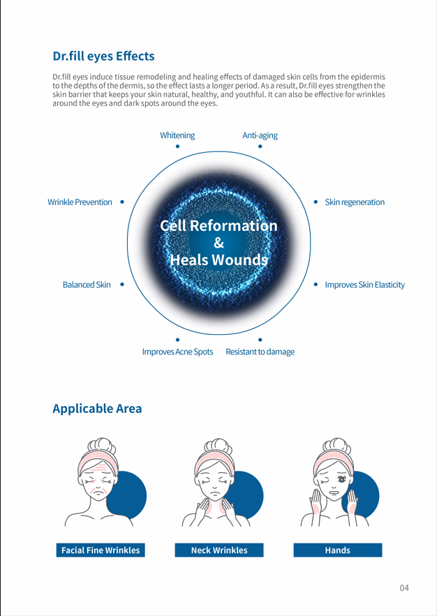 Dr. Fill Eyes is a regenerative skin treatment designed to rejuvenate and repair ageing or damaged skin. Formulated with polynucleotides (PN) derived from salmon DNA, it promotes cellular renewal, enhances skin vitality, and reverses visible signs of ageing. Administered via micro-injections into the epidermis, the treatment gradually revitalises the skin for a smoother, firmer, and more radiant appearance.